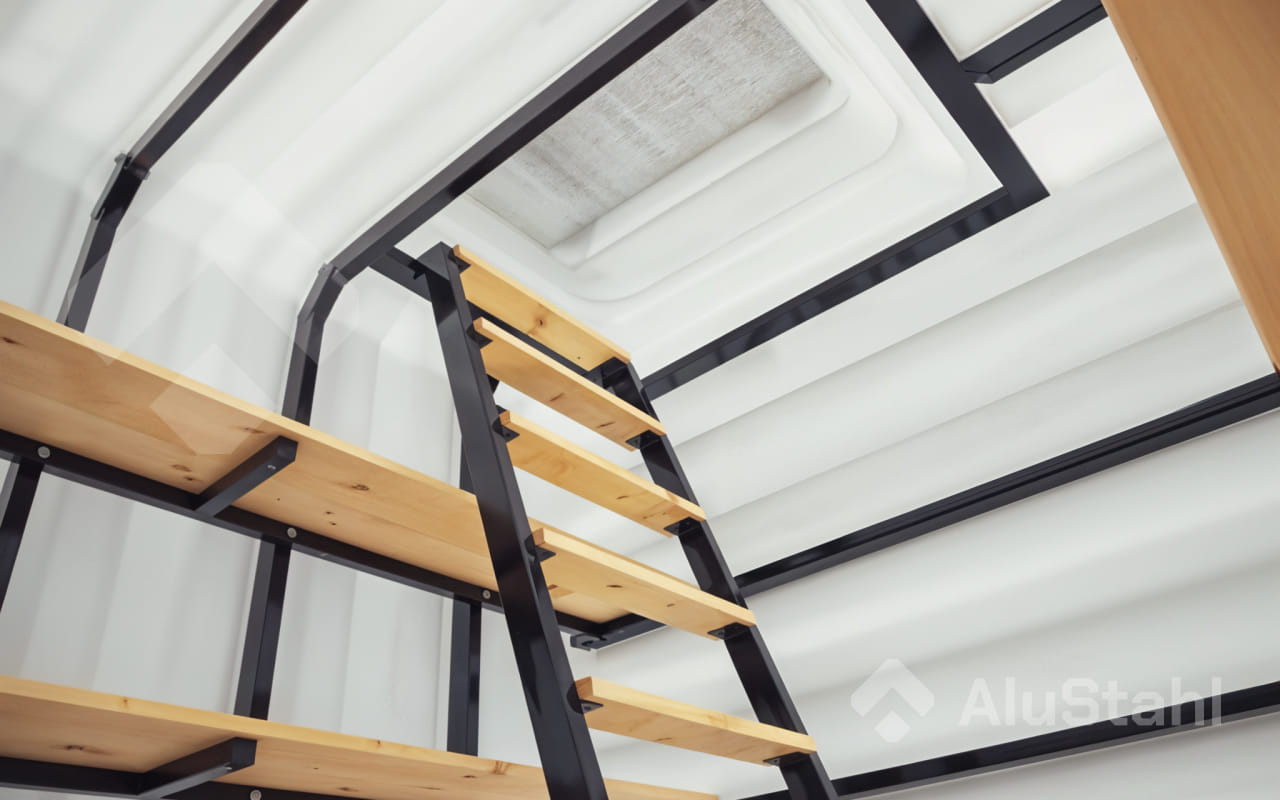 Metalltreppe mit OSB-Stufen, leicht geneigt