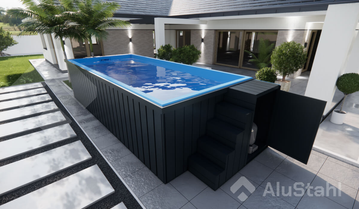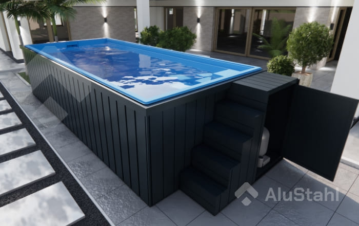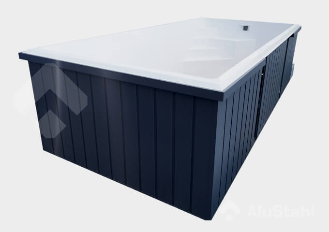 Unsere Schwimmbecken werden komplett einsatzbereit an die Kunden geliefert. Alle Seiten sind mit 0,5 mm dicken, verzinkten Stahlpaneelen in Anthrazit verkleide.