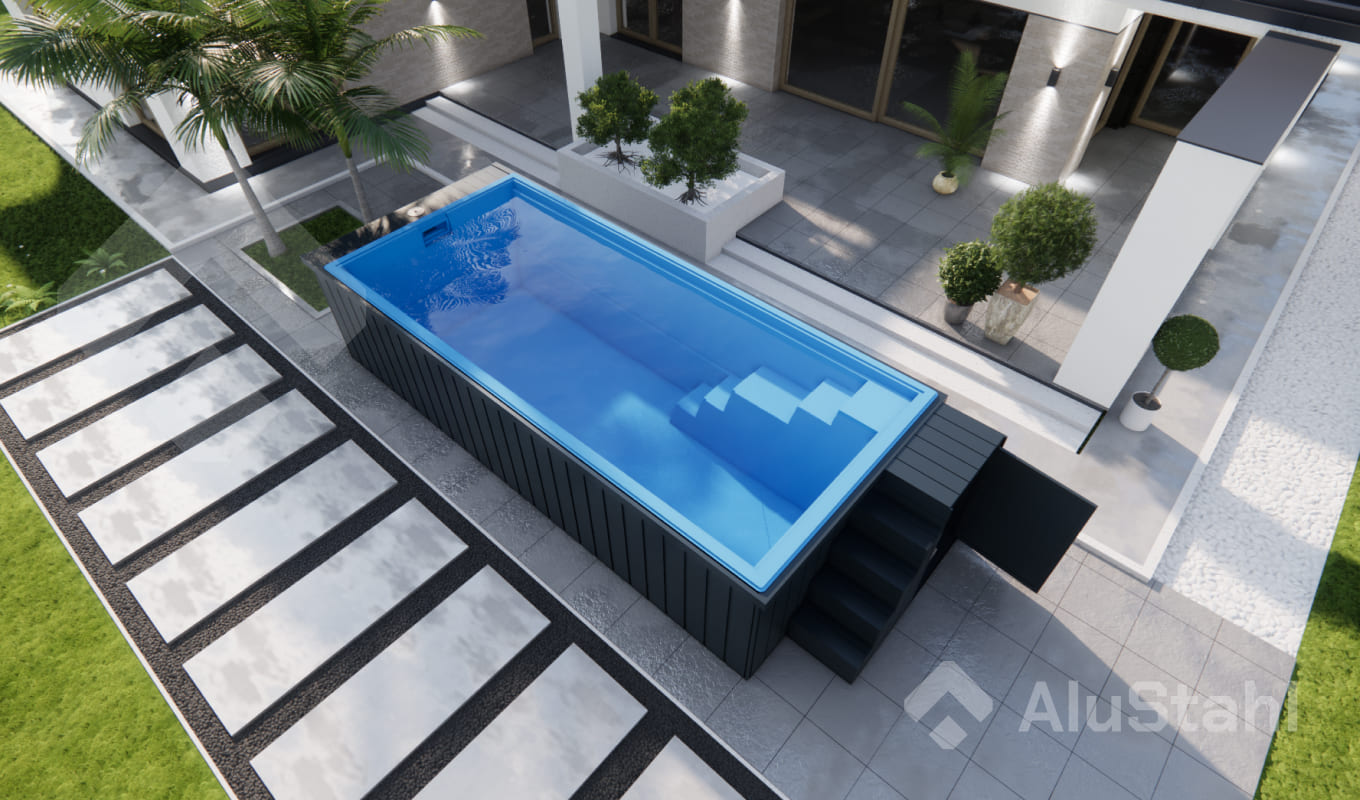 Unsere Schwimmbecken werden komplett einsatzbereit an die Kunden geliefert. Alle Seiten sind mit 0,5 mm dicken, verzinkten Stahlpaneelen in Anthrazit verkleide.